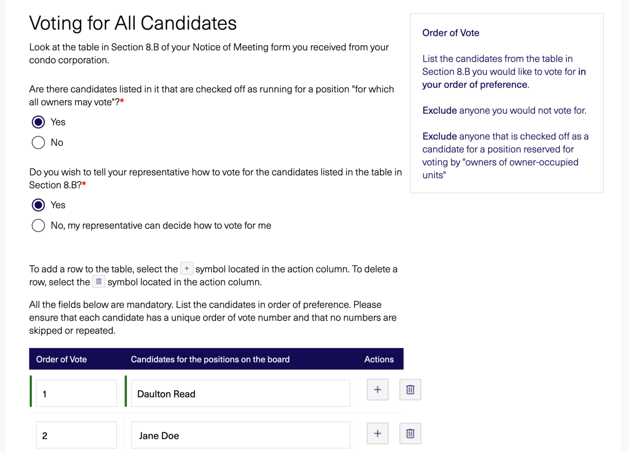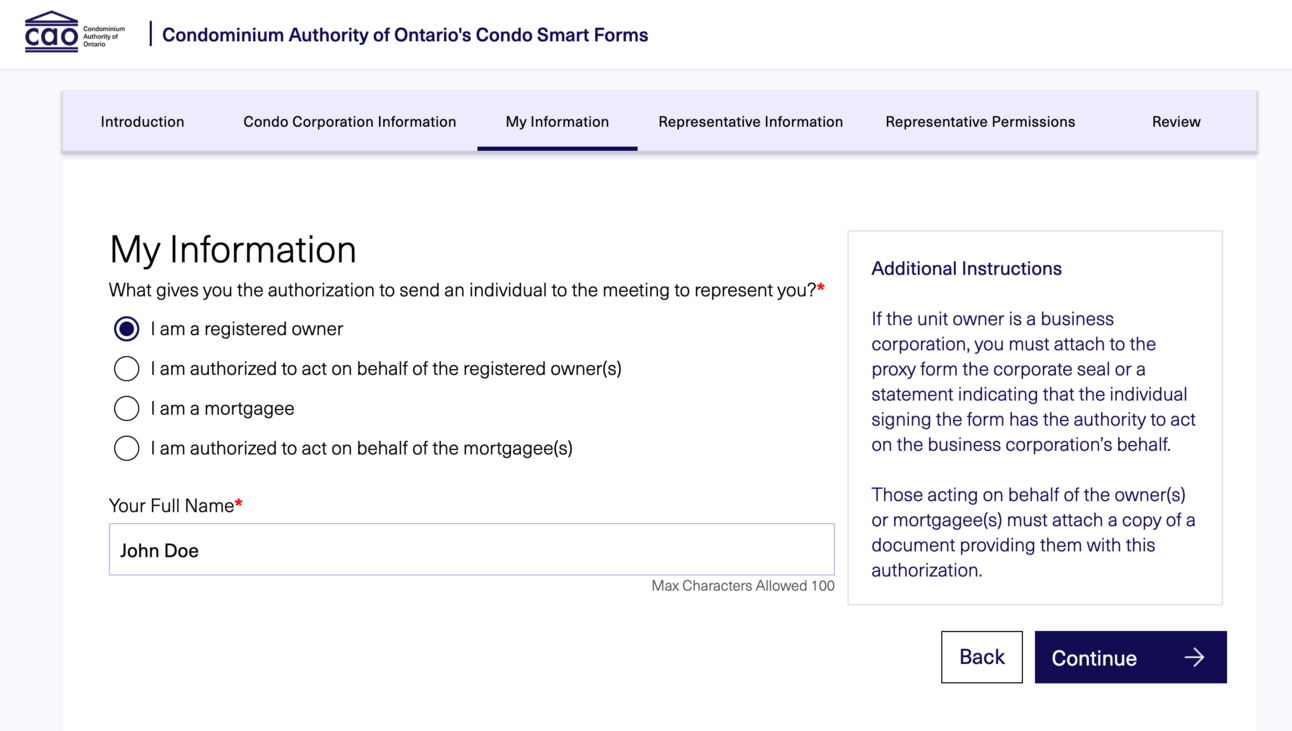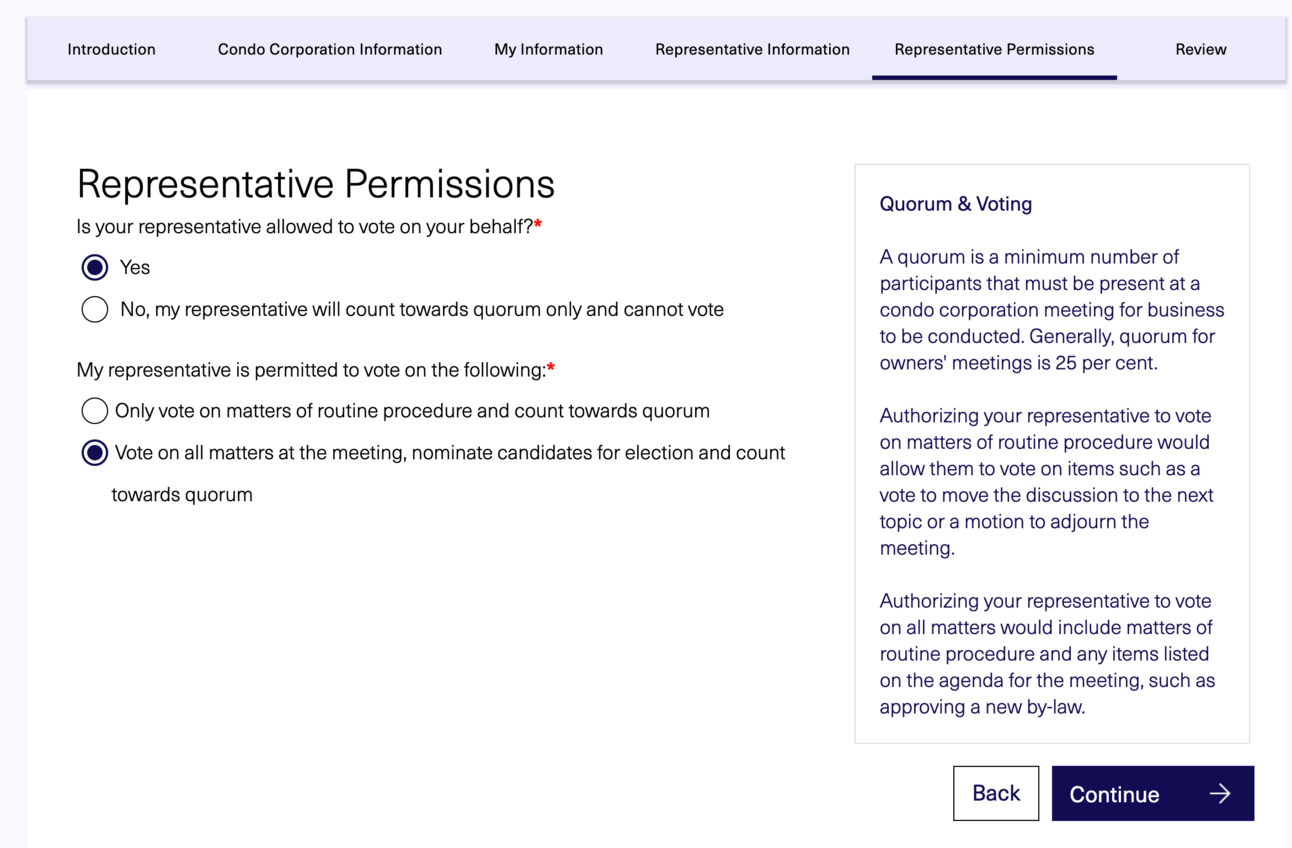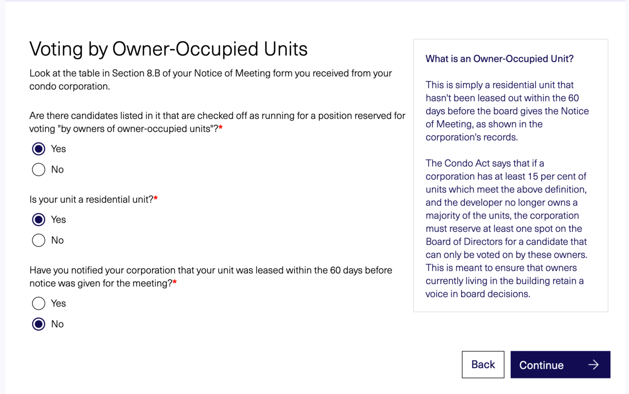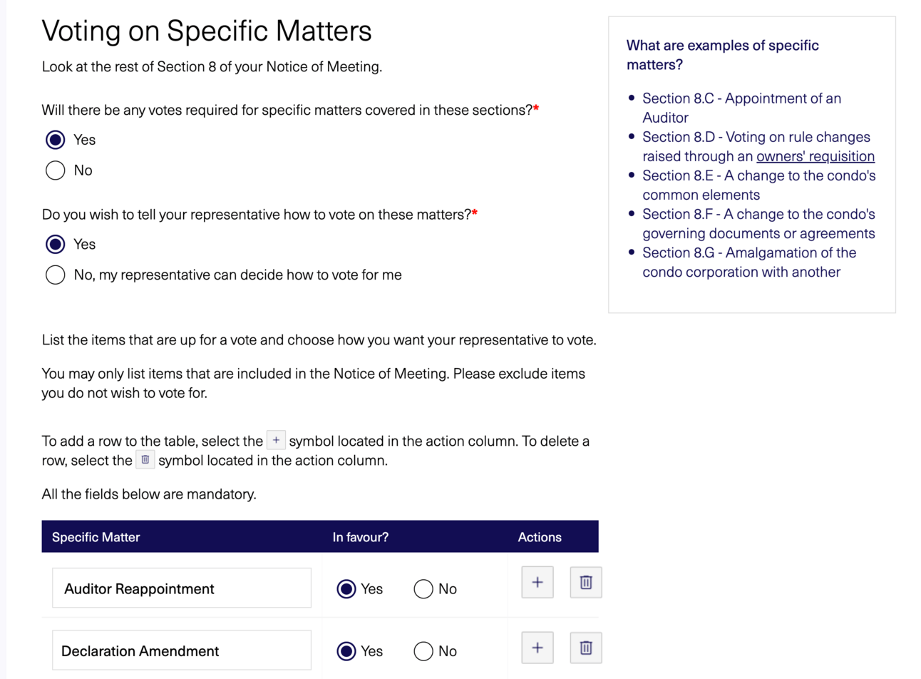 The enhanced Q&A-style proxy form uses a simple questionnaire that pulls key info from your Notice of Meeting (the document you receive before your AGM or special meeting). Based on your responses, the form automatically generates a completed PDF proxy form you can print, sign, and deliver to your condominium corporation or another owner attending the meeting.